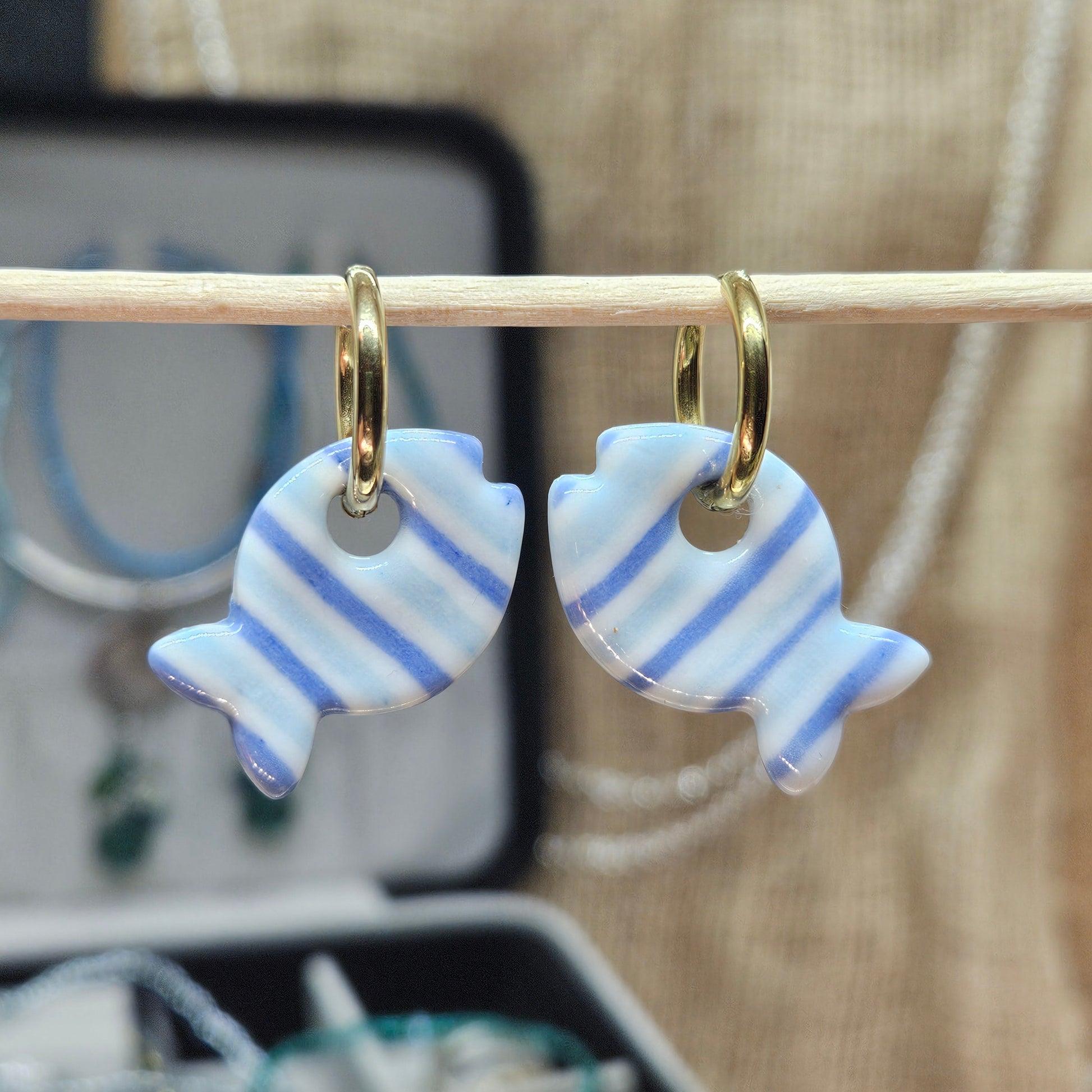 Pendants d'oreilles en forme de poisson en porcelaine teintée dans la masse. Créoles en acier inoxydable, dorées ou argentées, en 16mm de diamètre. Poids : entre 3 et 4g par boucle.